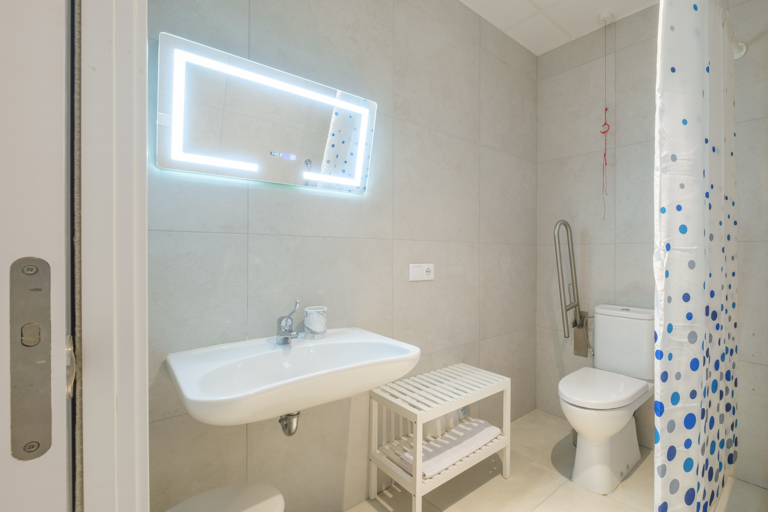 Das Badezimmer ist sehr geräumig und sauber und speziell für Menschen mit eingeschränkter Mobilität konzipiert.