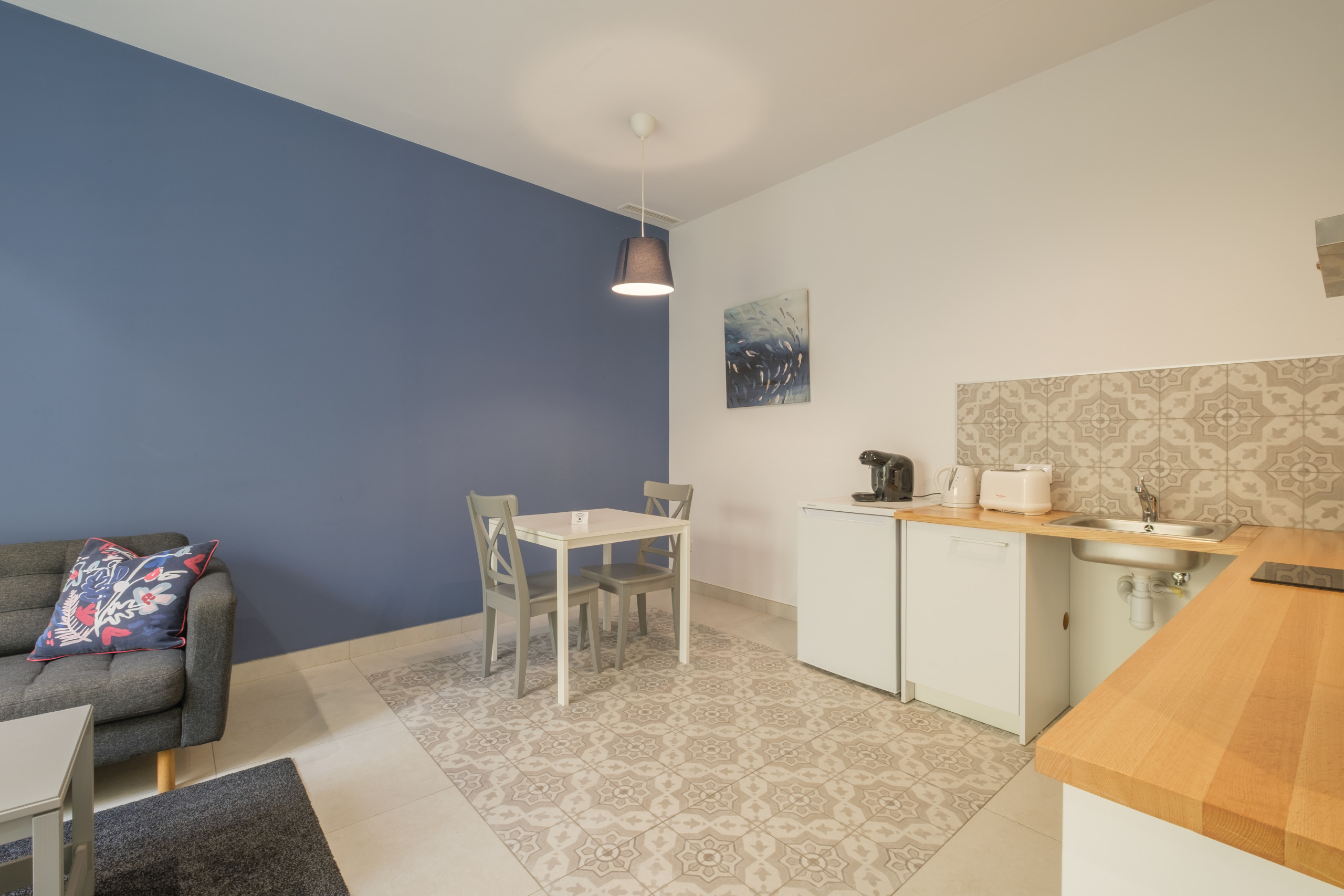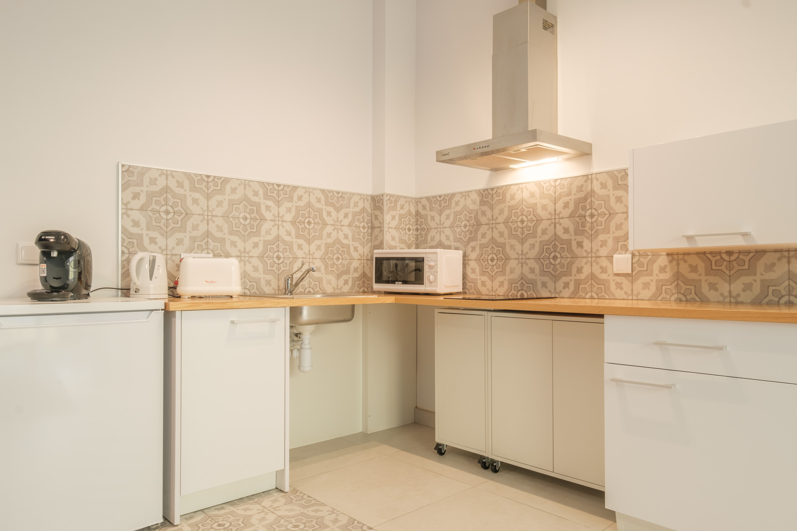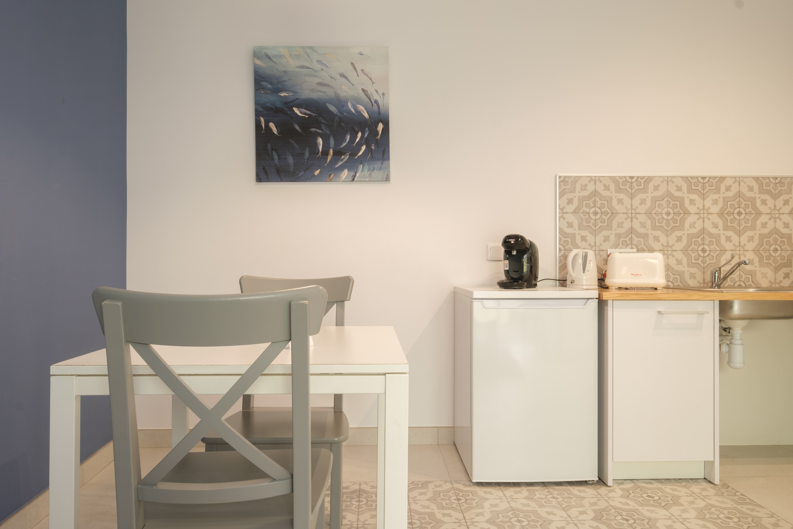 Die Küche ist ausgestattet mit Kühlschrank, Herd, Mikrowelle, Kaffeemaschine und elektrischem Wasserkocher, alle nagelneu. Zusammen mit einem kompletten Besteck-Set, Weingläsern, Geschirr, Töpfen und Pfannen. Alles, was man zum Kochen und Essen zu Hause benötigen könnte.