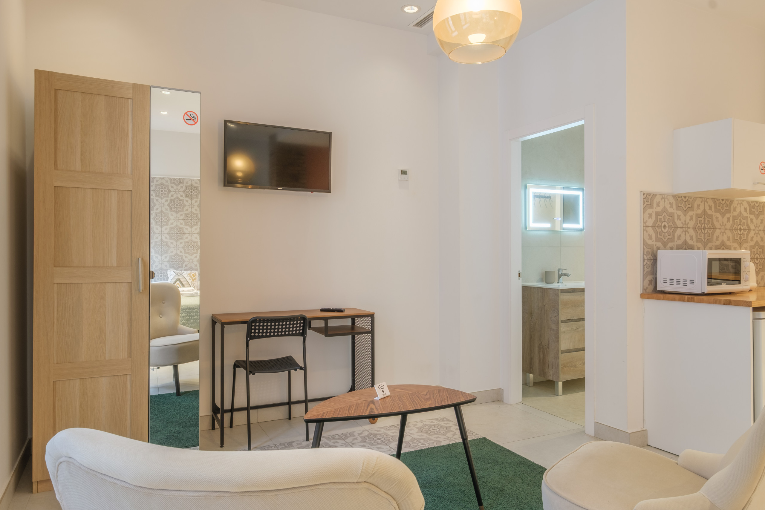 Nell'area living ci sono due comode sedie, scrivania, tavolo da pranzo e TV.
