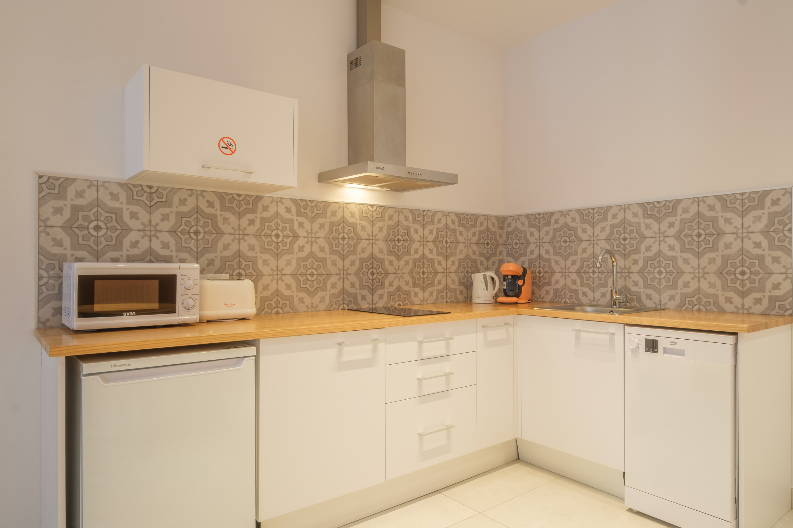 La cucina è attrezzata con frigorifero, fornello, microonde, macchina da caffè e bollitore elettrico, tutti nuovi di zecca. Insieme a un set completo di posate, bicchieri da vino, piatti, pentole e padelle. Tutto ciò che potrebbe servire per cucinare e mangiare a casa.